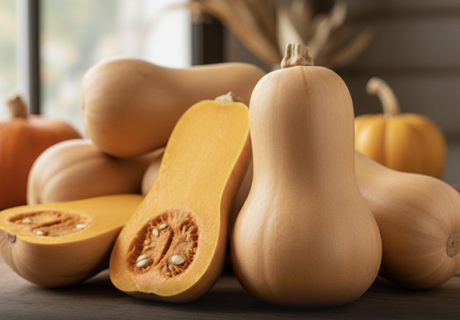 バターナッツかぼちゃは、ひょうたん型の細長い見た目がユニークなカボチャです 。北アメリカから南アメリカの砂漠地帯が原産とされ、日本には比較的新しく入ってきました 。近年ではホームセンターなどで種や苗が販売されており、家庭菜園でも人気が高まっています 。外皮は黄土色〜淡いベージュ色で一見カボチャらしくない色合いですが、半分に割ると中から鮮やかなオレンジ色の果肉が現れます 。名前の通り「バターのようになめらかでナッツのように甘い」風味が特徴で、繊維質が少なく加熱するととろりとなめらかな舌触りになります 。ポタージュやスープ、ピューレにするとクリーミーでコクのある味わいを楽しめるため特におすすめです 。もちろん、ローストしてグリル野菜にしたり、角切りにして煮込み料理やカレーに入れるなど幅広いレシピに活用できます。