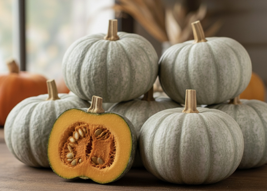 雪化粧(ゆきげしょう)かぼちゃは、その名の通り灰白色の粉をふいたような外皮が特徴的な西洋カボチャの品種です。見た目は白皮ですが、うっすら薄緑がかったグレーにも見えるユニークな色合いで、果実はずっしり2.3kg前後になる大型種です 。