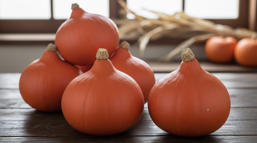 黒緑色が多い栗カボチャの中で、打木赤皮甘栗は名前の通り鮮やかな赤みがかったオレンジ色の皮が目を引きます。形は丸みを帯びていますが、ヘタが少し突き出しており、まるで玉ねぎのようなユニークなシルエットです。